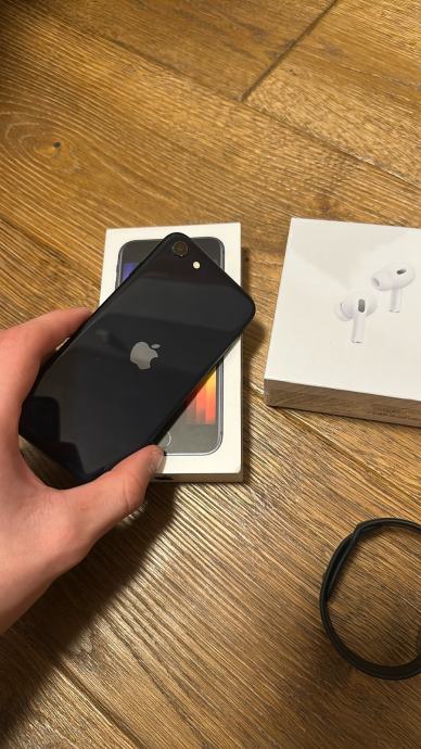 iPhone SE 3 dolazi u crnoj boji (Midnight) s originalnom kutijom. AirPods Pro 2 su također u originalnom pakiranju. Apple Watch Series 3 ima crni sportski remen i kućište od 42mm.