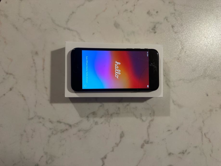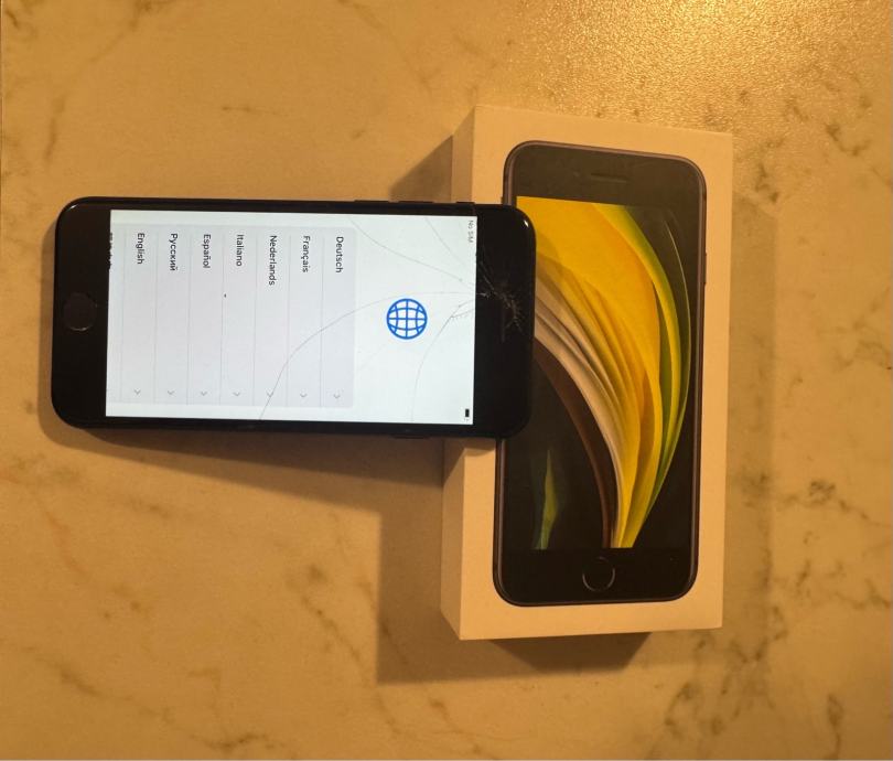 Prodajem Apple iPhone SE u crnoj boji. Uređaj se prodaje kao oštećen, što je vidljivo na ekranu koji ima pukotine. Dolazi s originalnom kutijom.