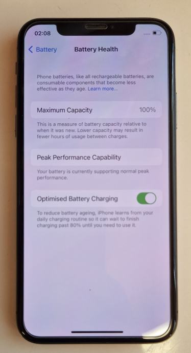 Status baterije 100%, mobitel je jako očuvan te ima manje tragove korištenja po rubovima.