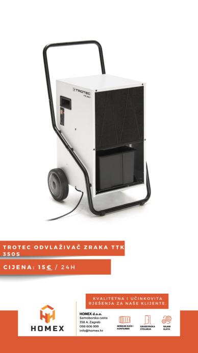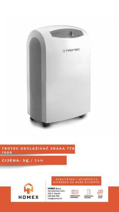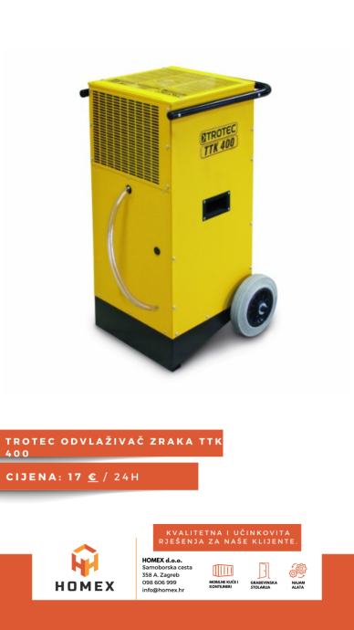 TROTEC TTK 400 je visokoučinkovit odvlaživač zraka koji je idealan za isušivanje prostora nakon poplava ili u građevinskim radovima. S kapacitetom odvlaživanja do 75 litara dnevno, ovaj uređaj nudi vrhunske performanse, a pogodan je za prostore do 940 m³.