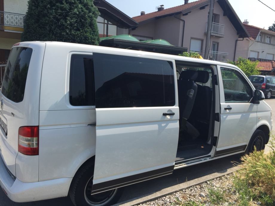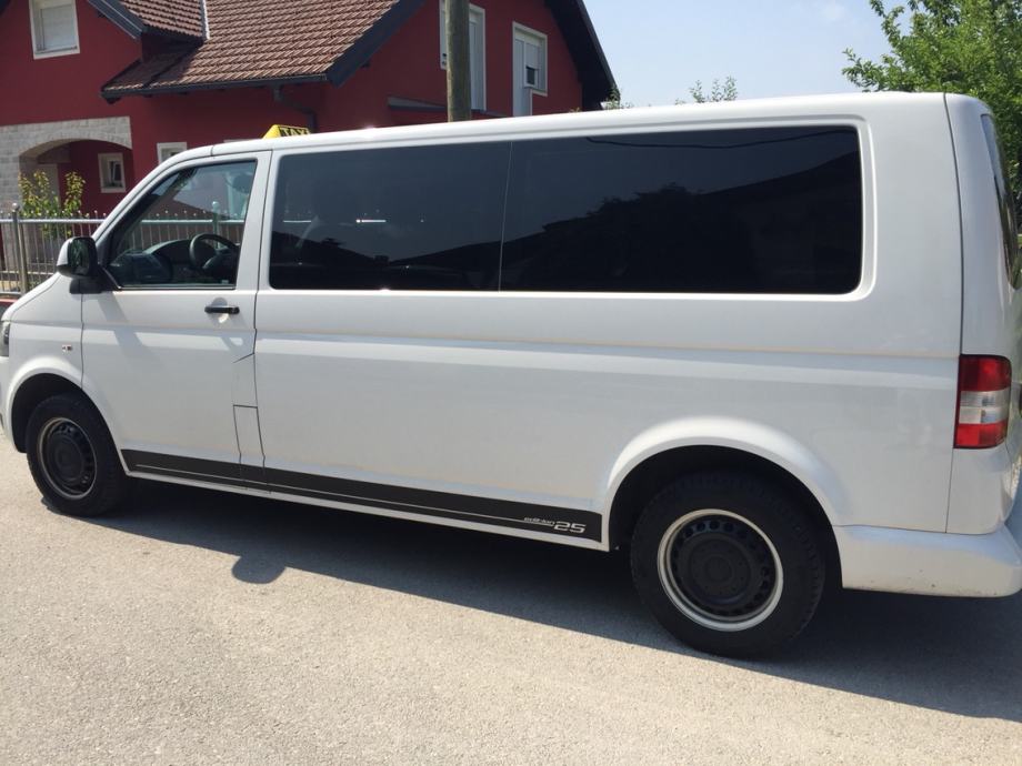 Najam se vrši komfornim VW T5 Edition 25 klimatiziranim vozilom 8 putnika + 1 vozač sa dvostrukom klimom i grijanjem (prednja/stražnja) ,parkirni senzori, vinjete AT i SLO