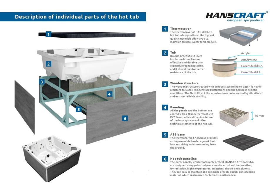 + Najdeblja konstrukcija kade na tržištu. Izolacija i konstrukcija: Green Shield (100% reciklirajući) pojačanog s međuslojevima od ABS-a s toplinskom izolacijom od Artic-a.