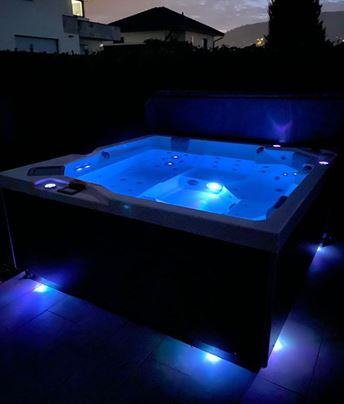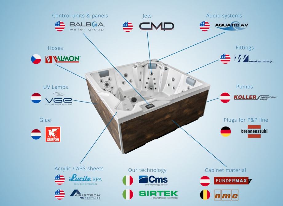 + Vrhunska kvaliteta, 100% europska proizvodnja. Svi važni djelovi iz Europe ili SAD (npr. pumpe, oplate, elektronika, audio, UV lampe, akril, mlaznice).