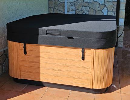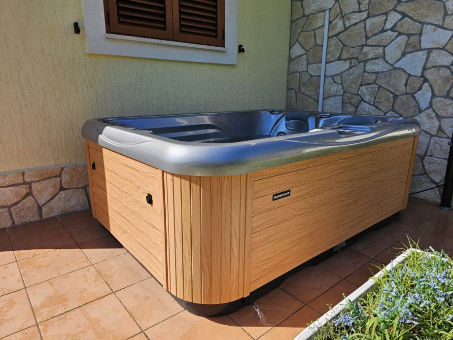 Visoko kvalitetna hidromasažna kada s terapeutskim masažama za tri osobe. Ova verzija ima (imitaciju) tik oplate. Postoji i verzija koja ima angtracit oplate.