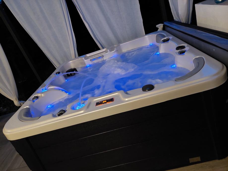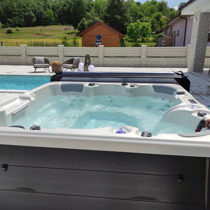 Hidromasažni bazen, vanjski jacuzzi za 5 osoba, 190x190cm, 2 ležeća i 3 sjedeća mjesta, sjajni sivo bijeli acril, 34 mlaznice, cirkulacijska /masažna pumpa, GECKO Kanada najbolja automatika, 2kW grijač, LED RGB rasvjeta centralna 5 inča i 12x točkice po vodenoj liniji, 4x vanjska LED RGB rasvjeta na kutevima, toplinska izolacija za manju potrošnju struje.....