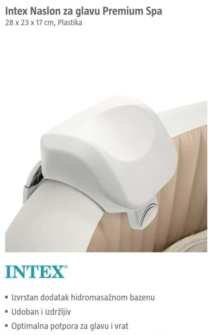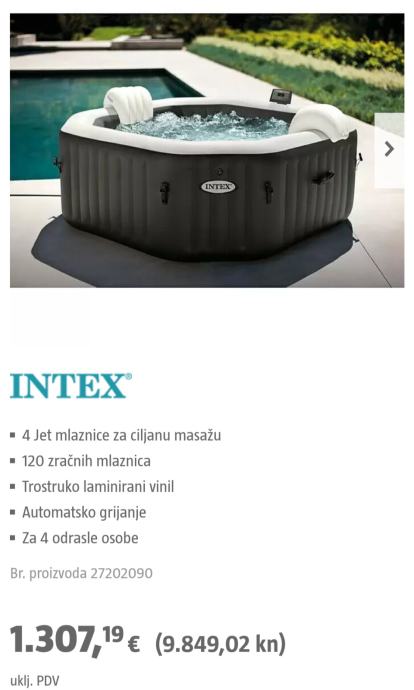 Masažni bazen za slanu vodu predstavlja najnoviju generaciju Intex proizvoda. Izrađen je od troslojnog laminiranog vinila koji jamči stabilnost i sigurnost. Dizajniran je za maksimalno 4 osobe i sadrži 120 zračnih mlaznica. Također posjeduje grijač vode. Koristen je jednu sezonu, opran i upakiran u orginal kutiju. Uz jacuzzi dolazi i stalak za čaše, dodatna dva naslona za glavu te sol za kloriranje vode.