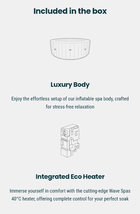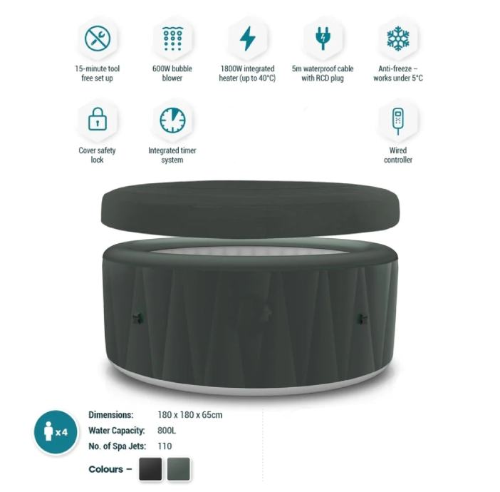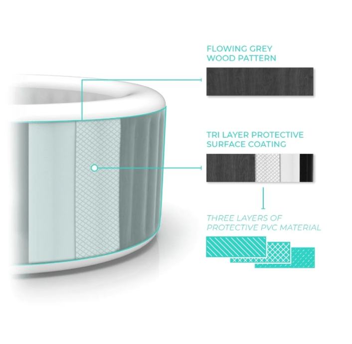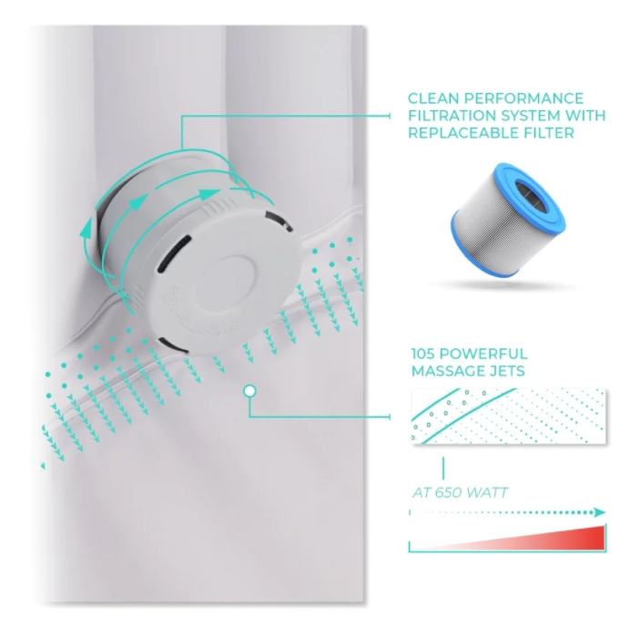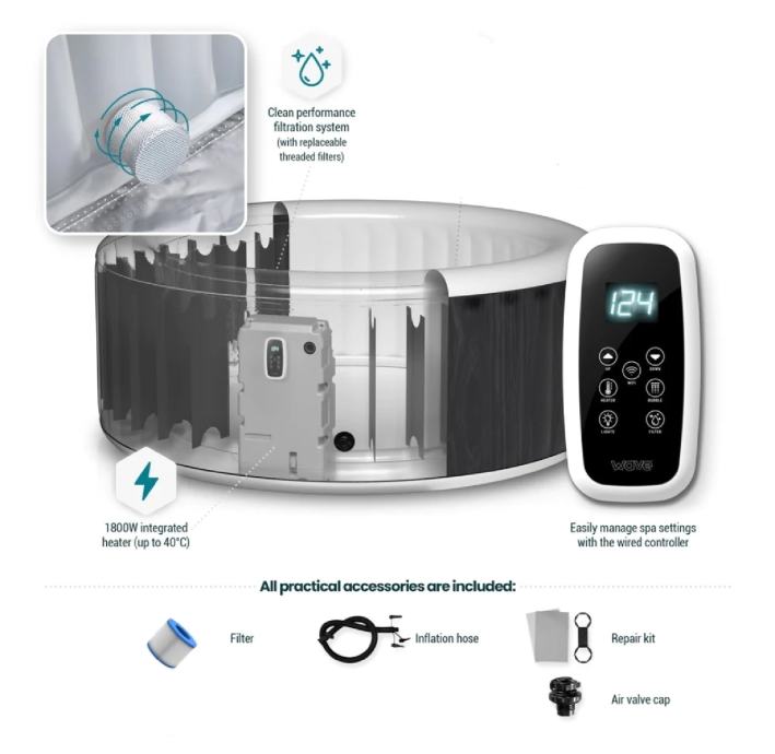 Hidromasažni bazen stvara oazu opuštanja i uživanja. Ima mekan i izoliran pod koji služi kao udobno sjedalo. Dizajnirani da izdrže, zidovi bazena su izrađeni od čvrstog troslojnog PVC materijala. S termostatom imate mogućnost podešavanja temperature do 40 °C.