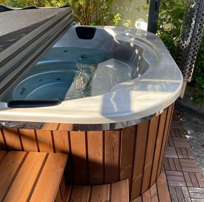 Prekrasna drvena kupka / hot tub. Školjka je napravljena od pravog akrila, koji je puno kvalitetniji materijal nego fiberglas. 100% EU proizvodnja!