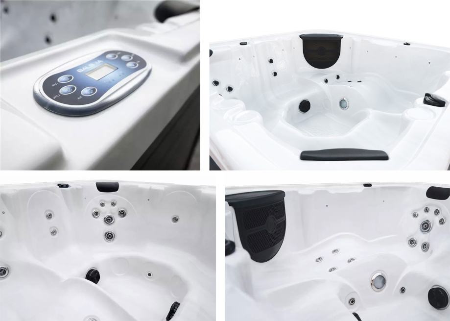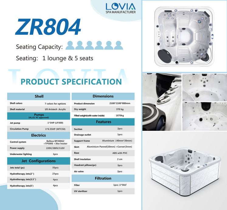 LOVIA SPA, ZR 7102, kvalitetni hidromasažni bazeni, 200x200x85cm, za 5 osoba, lagana i trajna ALU podkonstrukcija, USA ACRYL otporan na UV zračenje i kemiju za održavanje vode, GLOSSY WHITE , PU tvrda pjena za toplinsku izolaciju, plastično dno, bazen je odozdo zatvoren, USA CMP mlaznice, GECKO Kanada K300 elektronika i grijač, LX štedljiva cirkulacijska pumpa i posebno još 2 masažne pumpa OZONATOR+UV DEZINFEKCIJA vode, prvi u EU, jedinstveno, dosad ugrađivanom samo u 2x skuplje bazene, LED rasvjeta, centralna + točkice po vodenoj liniji, vanjska obloga tamno sivo , UV otporno i vodootporno....