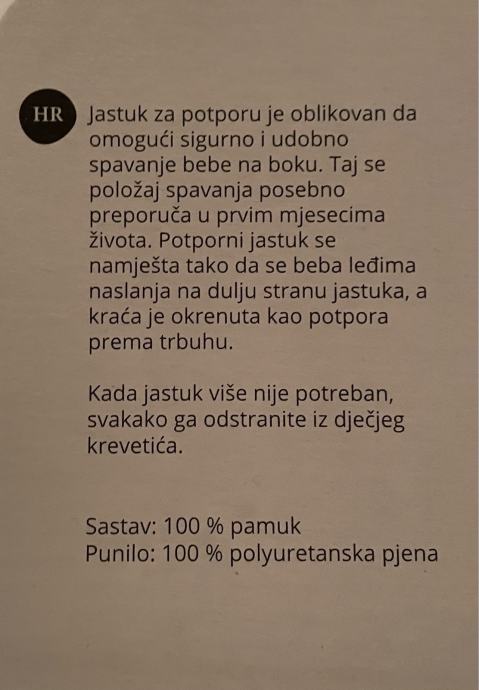 Kada mjenjate položaj spavanja s lijevog na desni bok ili obrnuto, potporni jastuk mora biti namješten tako da duži dio podupire leđa novorođenčeta. Lagana, praktična i jednostavna upotreba u kući (u dječjem krevetu, kolijevci ili krevetu) ili na putu (u kolicima ili dubokoj košari)