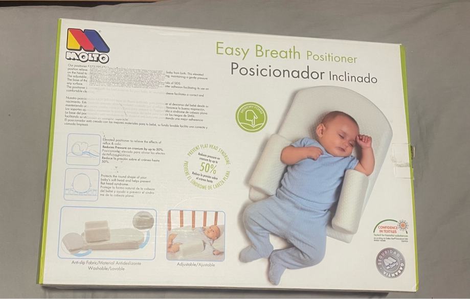 Prodajem novi potporni jastuk za bebe Molto Easy Breath Positioner. Radi se o pozicioneru koji pomaže bebi održati stabilan položaj tijekom spavanja. Jastuk je podesiv, izrađen od anti-alergijskog materijala te je periv.