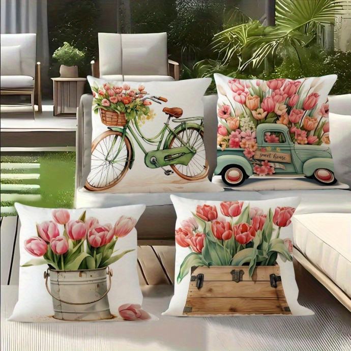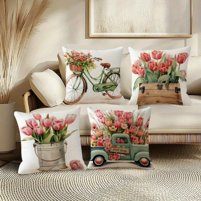 4 kom rustikalnih cvjetnih jastučnica - vintage cvjetni uzorak (tulipani, bicikl, kanta) - jastučnice s patentnim zatvaračem, pogodne za sofu, dnevni boravak, spavaću sobu, terasu - rustikalni dekor za dom koji se može prati ručno - umeci za jastuke nisu uključeni - savršen poklon za useljenje