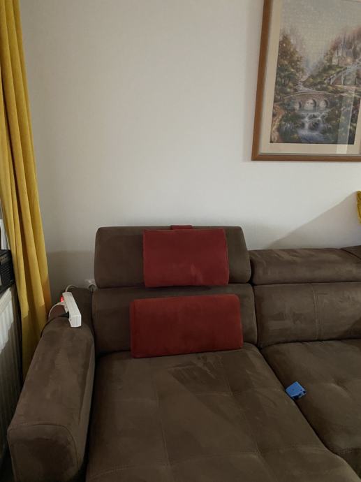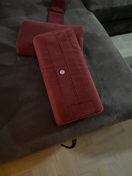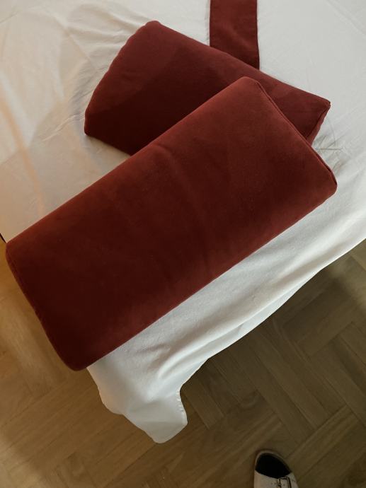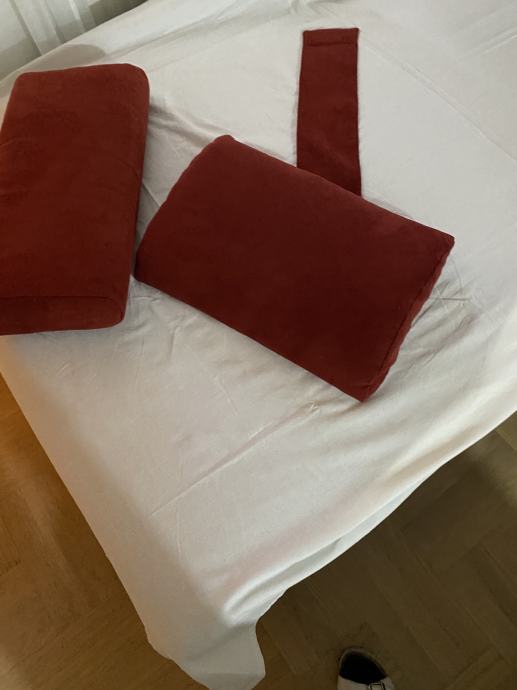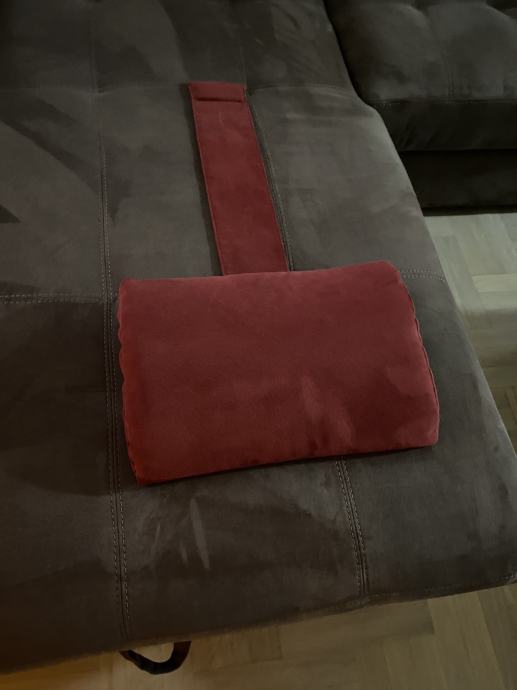 Novi jastuci plisani 2 komada u kompletu..boja trule višnje, jedan za vrat i gornji dio leđa, sa mogučnosi skidanja navlake i pranja.. i u produžetku traka sa usivenim metalnim držacem.