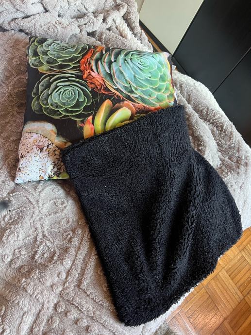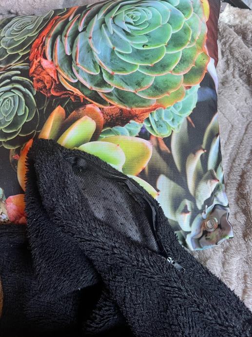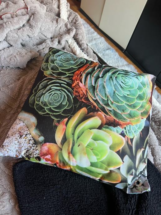 Prodajem novi jastučić s navlakom, dimenzija 45x45 cm. Navlaka je ukrašena fotografskim printom sukulenata u zelenim, smeđim i narančastim tonovima, što mu daje moderan i živopisan izgled.