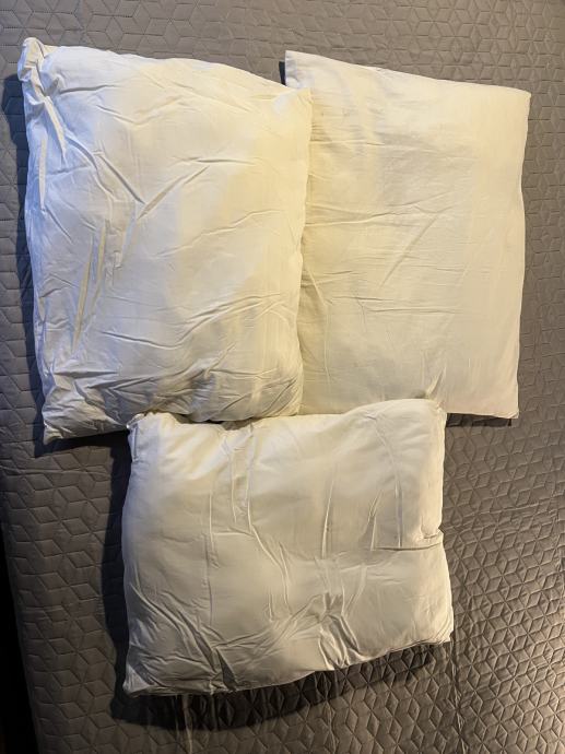 Jastuci su korišteni, neko vrijeme su stajali u vakumskoj vreći i imaju pokoji flek, nisam ih prala, ali se jednostavno peru u veš mašini. Pošto ih ne namjeravam više koristiti dajem ih povoljno za neki diy ili za peseka ili sl. Dimenzije cca. 70 x 55/60 cm