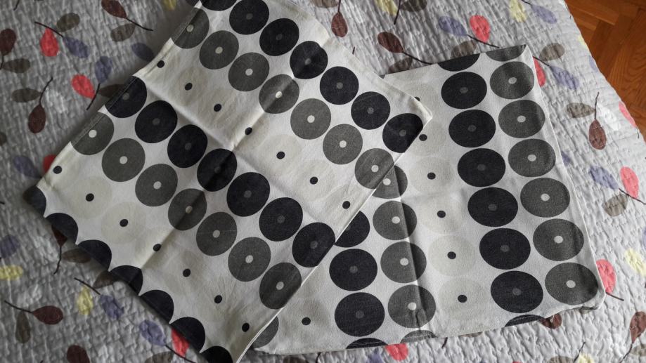 Jastucnice u bijelo, smede, crnoj kombinaciji boja. Dimenzije 36 × 43 cm.