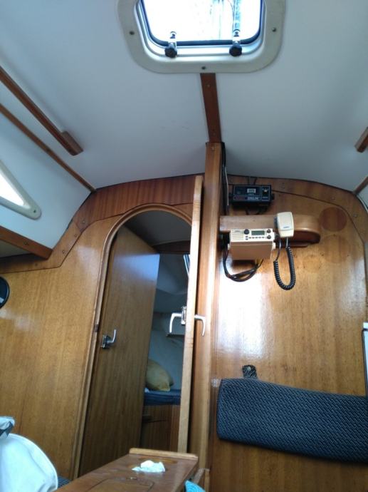 Jedrilica (8,5 m) ima 5 ležajeva (dva u prednjoj kabini, dva u salonu i jedan ispod desnog kokpita. Napominjem da su i klupe u kokpitu dovoljno dugačke za ležanje! Za druženje i objedovanje postoje dva stola. Jedan je u salonu koji je tijekom manipulacije u salonu spušten s obje strane, ali se ne može spuštati na nivo ležajeva. Drugi je u kokpitu, demontažni, čvrst!