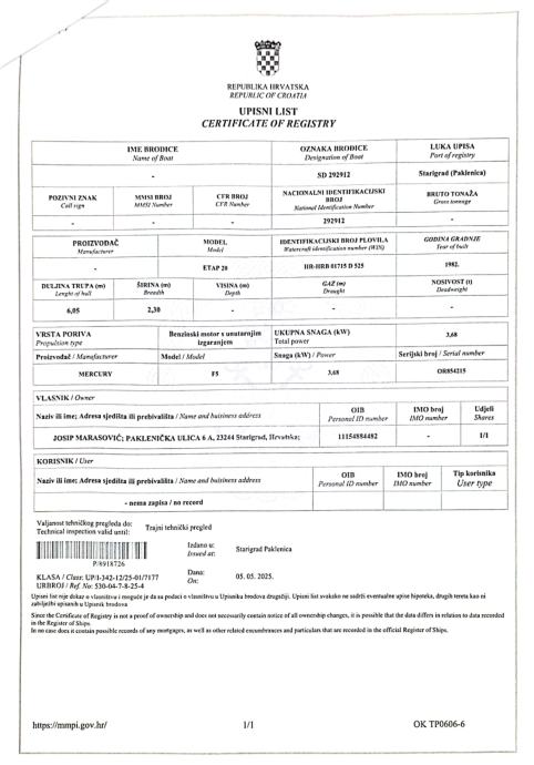 Jedrilica Etap 20 , registrirana u Statigradu Paklenici, trailer,penta Mercury 5ks.