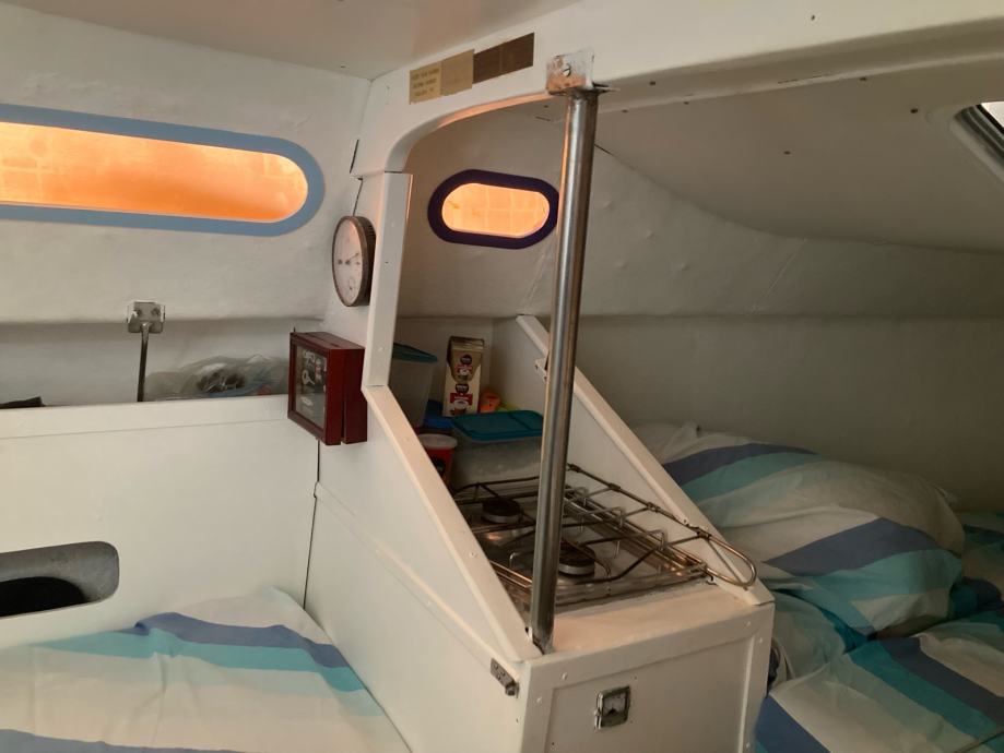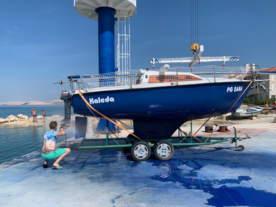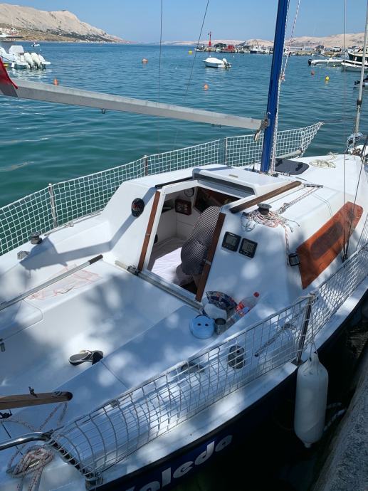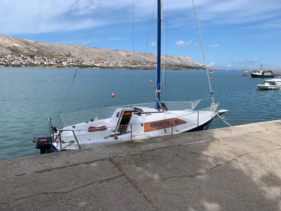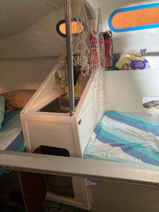 Jedrilica Kosanović, tipa Žut u odličnom stanju. Kompletno renovirana prije 4 godine, protuobraštajni premaz prije godinu dana. Ima ugrađeno plinsko kuhalo sa dva ringa i držačima za lonce. Sudoper s ručnom pumpom spojen je na inox spremnik od 70l za pitku vodu. Na dva bočna i na pramčanom ležaju mogu komotno spavati četiri osobe. Podnica pramčanog ležaja ujedno se koristi kao stol u kabini i kokpitu. Kuhinja je opremljena svim potrebnim (lonci, tanjuri, šalice, pribor za jelo…). Tenda je platnena, šivana prema jedrilici. Uz jedrilicu dajem i prikolicu. Trenutno je na suhom vezu u Pagu gdje se, po dogovoru, može i pogledati.