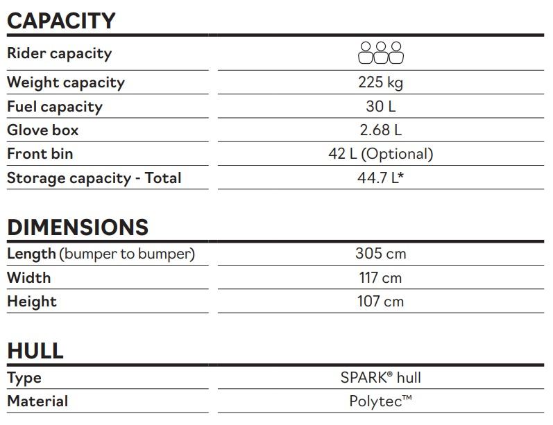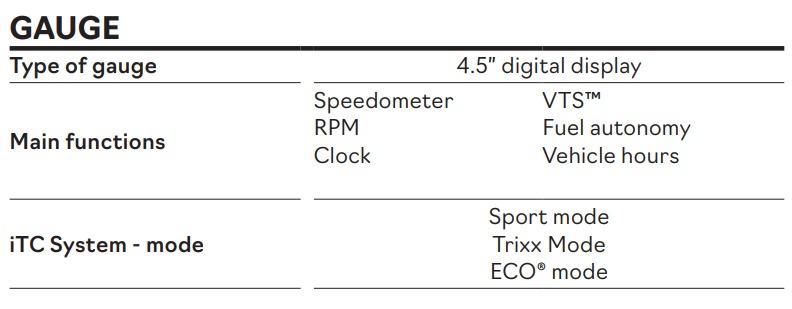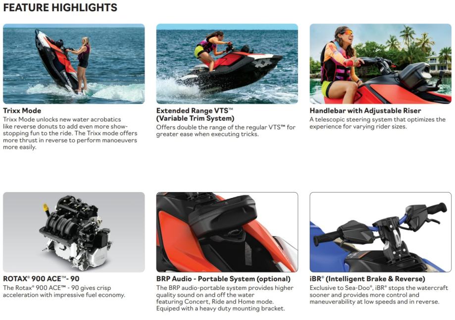 • TRIXX™ PACKAGE: BRP Audio - portable system (optional), handlebar with adjustable riser, Extended Range VTS™ - Variable Trim System, step wedges, Exclusive coloration
