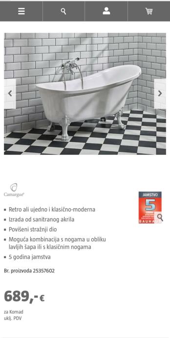 Prodajem novu, nikad korištenu, bijelu samostojeću kadu s ukrasnim nogama (šape), Caramague Siljan 150. Kupljena u Bauhausu. Originalna cijena je bila 689€.