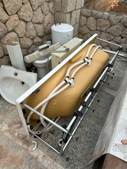 Prodajem komplet rabljene kupaonske opreme koji uključuje kadu s hidro masažnim mlaznicama ali je skinuta pumpa za iste. Umivaonik s postoljem, bide, Končarov bojler, električnu grijalicu te kupaonski ormarić s tri krila i lampom. Sve je demontirano i dostupno za preuzimanje. Prodaje se kao komplet.