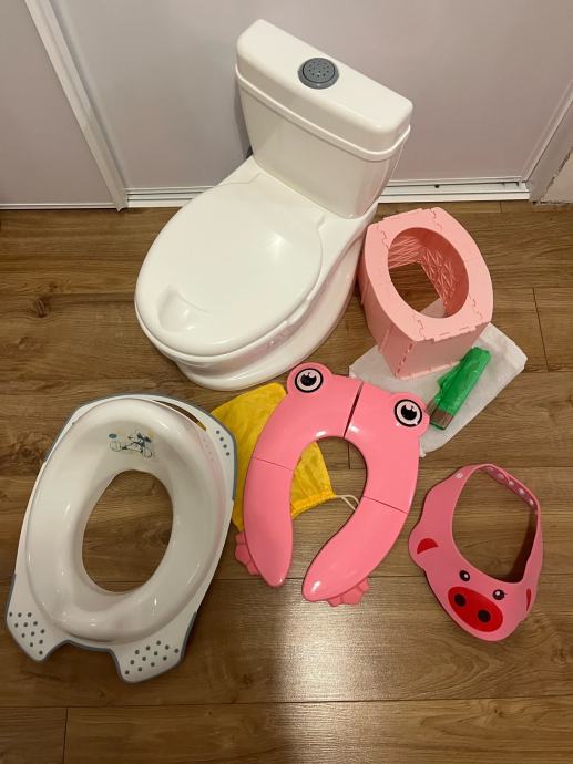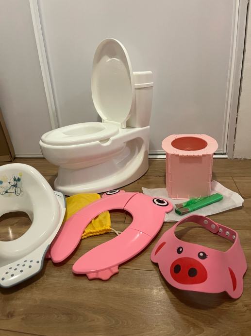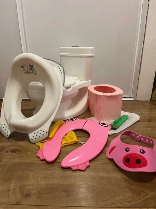 Prodajem Set: kahlica mali wc-idealna za ucenje samostalnih odlazaka na wc, putna sklopiva kahlica, nastavak i putni sklopivi nastavak, šilt za tuširanje i pranje kose i nastavak koji se može priključiti na pipu u kupaoni ili kuhinji ako trebate mali tuš za brzinsko pranje npr.djecje guze.:)