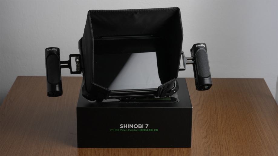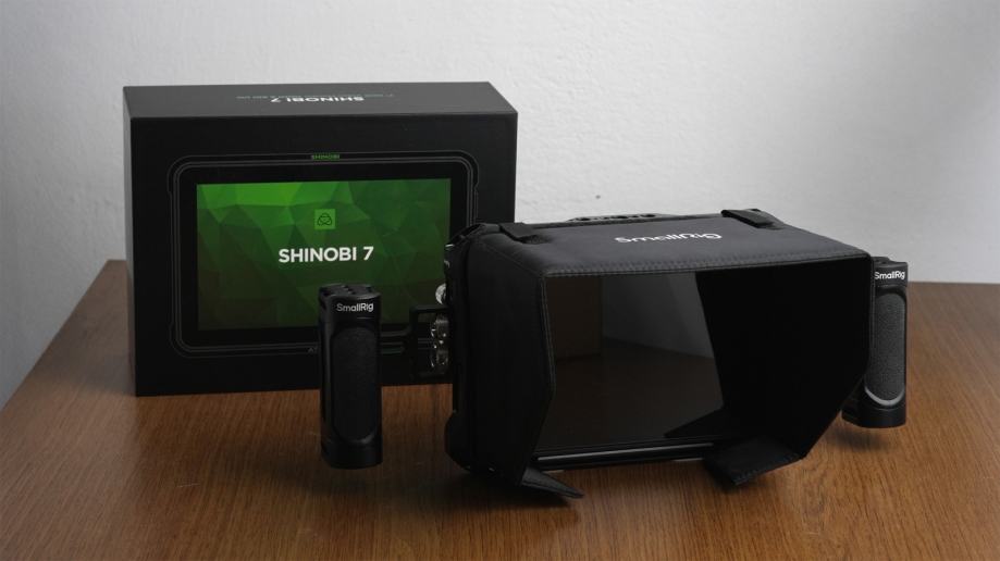 Atomos Shinobi 7” 4K 2200 nits. SmallRig AtomX cage s sunhoodom, zaštitom od kaljenog stakla, SmallRig Handles.