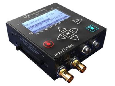 The camera-mountable nanoFlash, a miniaturized version of the award winning Flash XDR, has two CF card slots and embedded audio support only. nanoFlash can be powered from a camcorder battery (6.5-20VDC) and records 1080i60/50, 1080p30/25/24 or 720p60/50 at full raster (1920 x 1080i/p and 1280x720p) 4:2:2 MPEG2 at 50/100 Mbps (Long GOP) or 100/160 Mbps (I Frame only). As both a recorder and player, nanoFlash sports HD-SDI I/O as well as LTC in, wired remote control and a power/start/tally light connector.