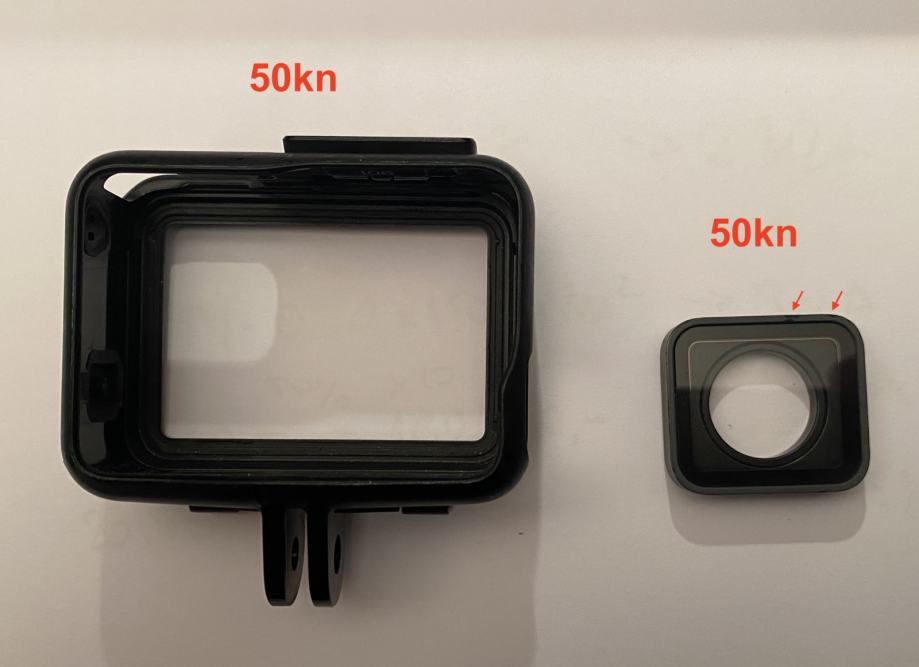 -leća (u stvari zaštitno staklo koje se skine ako se kamera treba staviti u podvodno kućište) ima oguljenu boju označeno na slici strelicama - 6,60€