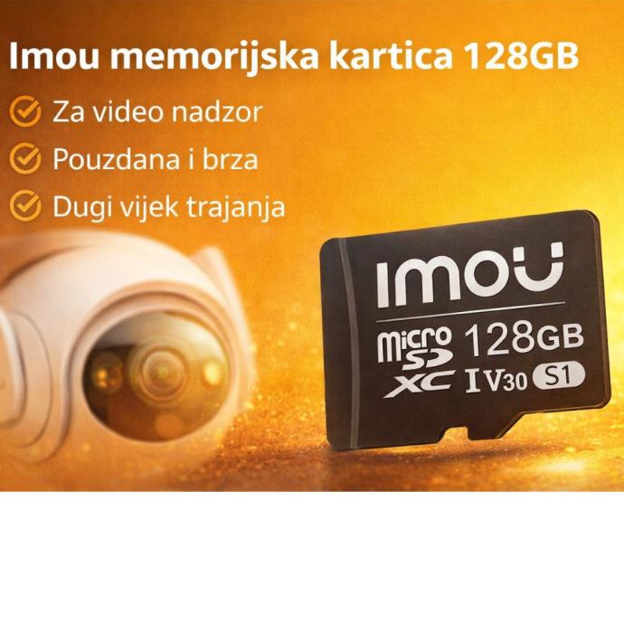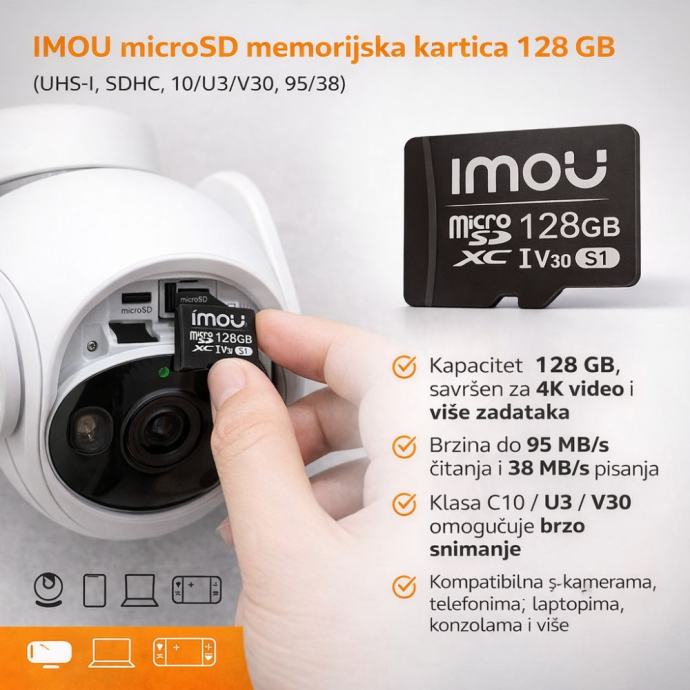 Memorijska kartica 128GB microSD namijenjena je za kamere, video nadzor i svakodnevnu pohranu podataka. Zahvaljujući visokim brzinama (U3 V30), omogućuje stabilno i kontinuirano snimanje bez prekida, uključujući i 4K video.