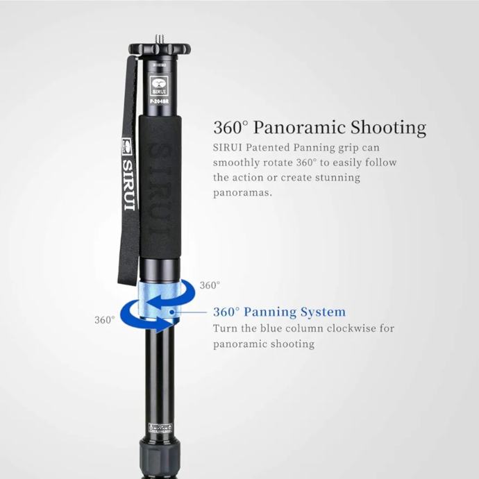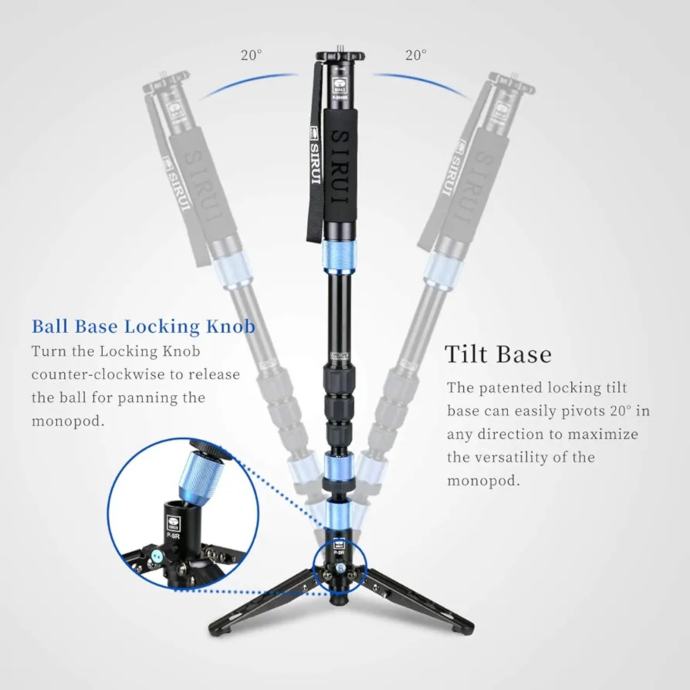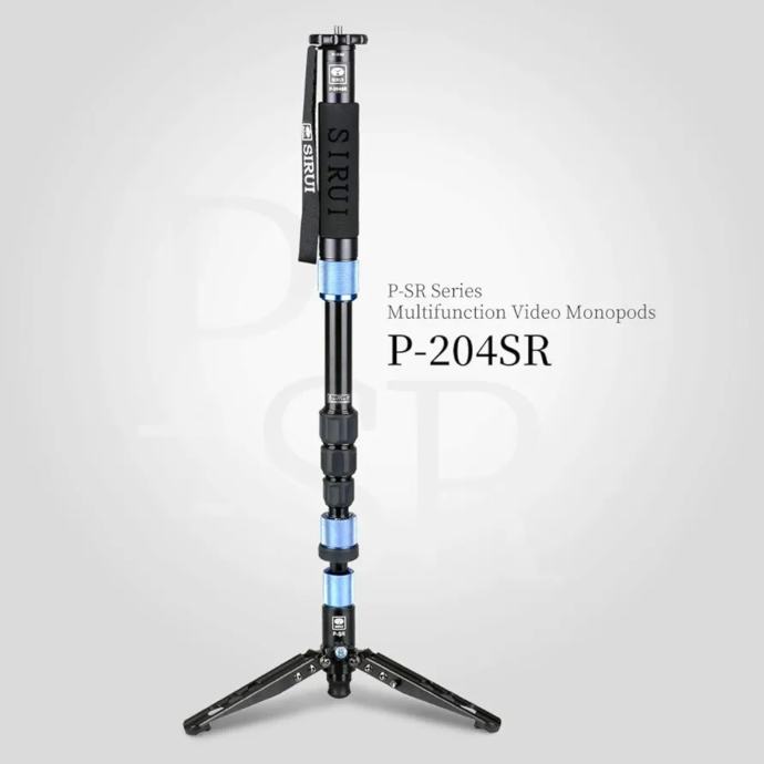 **Sirui P-204SR aluminijsko legirano foto/video monopod** je svestrani aluminijski stativ koji sadrži sklopivu, trojno nagnutu bazu za dodatnu stabilnost u izazovnim uvjetima. Baza omogućuje nagib od 20° u bilo kojem smjeru i ima gumene vrhove za sigurno prianjanje. Ovaj lagani, 1.5 kg teški monopod ima maksimalnu visinu od 160 cm i robusnu nosivost od 8 kg, što ga čini pogodnim za korištenje s dugim objektivima, DSLR-ovima, mirrorless kamerama, video kamerama i više. Nagnuta baza povećava stabilnost pri praćenju divljih životinja u pokretu ili panoramskom snimanju sportskih događaja. Nagnuta baza može se ukloniti iz monopoda i kombinirati s rukohvatom za formiranje praktičnog stolnog stativa, idealnog za stolnu fotografiju, kao i za video aplikacije poput videokonferencija, video tutorijala ili vlogova. Kada se monopod koristi bez nagnute baze, priložena gumena nožica ili šiljasta nožica može se pričvrstiti za stabilnost na bilo kojoj podlozi.