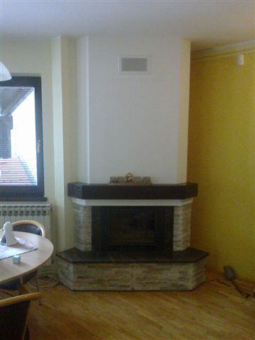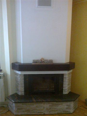 Kutni kamin jačine 8 - 21 kw. Temeljni dio i ložni dio obučeni u smeđu bunjicu ( prirodni kamen ). Polica temeljnog dijela, kao i okomice pored ložišta su od granita Himalaja Blue. Za gredu iznad ložišta je upotrijebljen hrast.