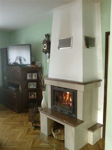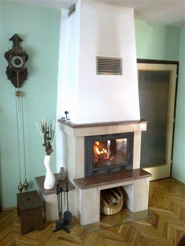 Kamin 8 - 21 kw snage , police od multicolora - Chili red. Temeljni i ložni dio obućen kamenim pločama.