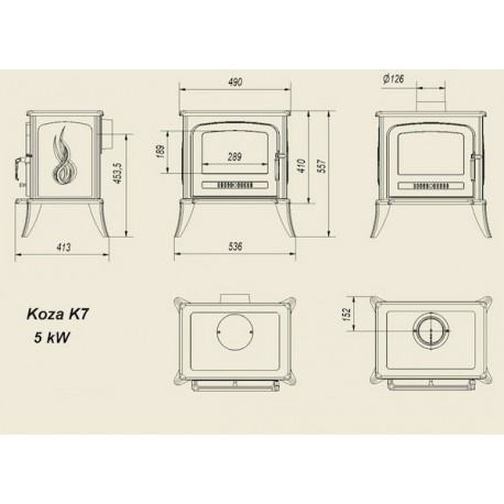 Tijelo kamina Koza K7 izrađeno je od kvalitetnog sivog lijeva klase 200, sa minimalnom debljinom stjenke 8 mm. U kućište je ugrađen deflektor koji produžuje ispušni put i povećava temperaturnu korisnost kamina. Vrata kamina izrađena su od sivog lijeva sa ugrađenom prozirnom staklo-keramikom otpornom na temperature do 800°C. Podešavanje protoka zraka vrši se kroz rešetku otvora za pepel. Mogućnost instalacije dimovodnog izlaza na leđima ili gornjoj strani kamina.