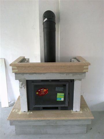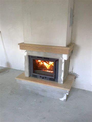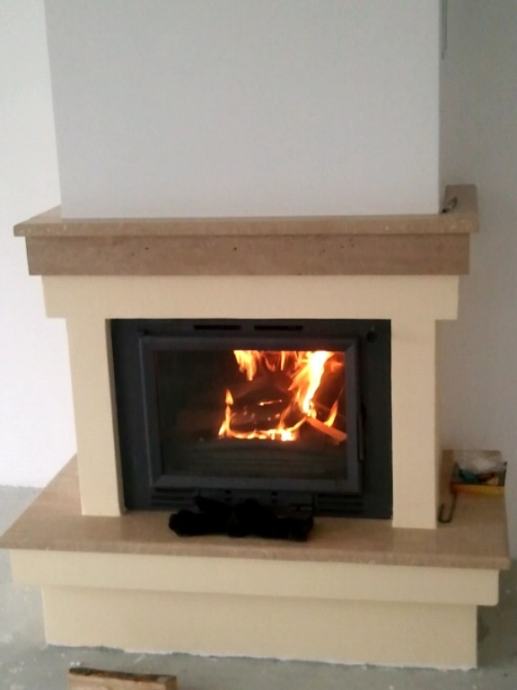 Kamin snage 10 kw ložište Invicta Minos, obložen kamenom Travertin, čije su vodoravne plohe kitane i polirane a okomite ( čeone ) samo polirane. Kamin u izvedbi roh bau - do faze farbanja