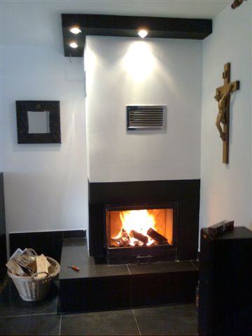 sobni kamin jačine 8 - 12 kw, ekonomičan, uklopiv u svaki prostor. Lateralno otvaranje, prednje staklo. Temelj je rađen sa keramičkim pločicama. Za slučaj da umjesto njih ide granit, korigira se i cijena na višeb što opet ovisi o vrsti granita.