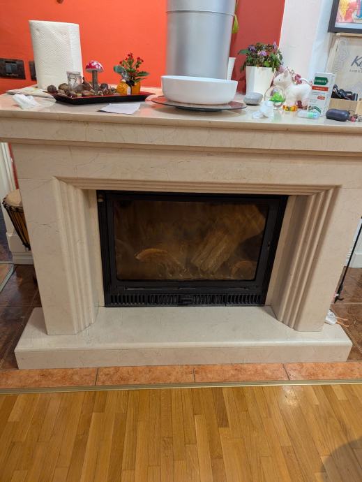 Prodajem kamin s okvirom od španjolskog kamena u krem/bež boji.