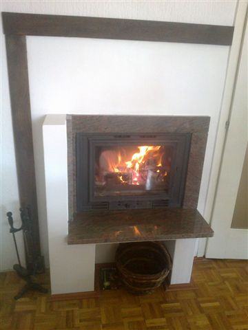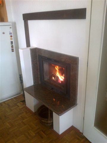 Kamin jačine 8 - 12 kw. Smješten je u zid dnevnog boravka, tako da je komora kamina koja grije zrak u susjednoj prostoriji. Ugrađen je kamen Multicolor Bolivari.