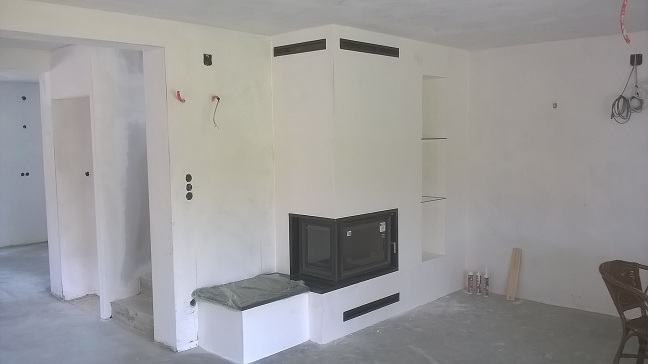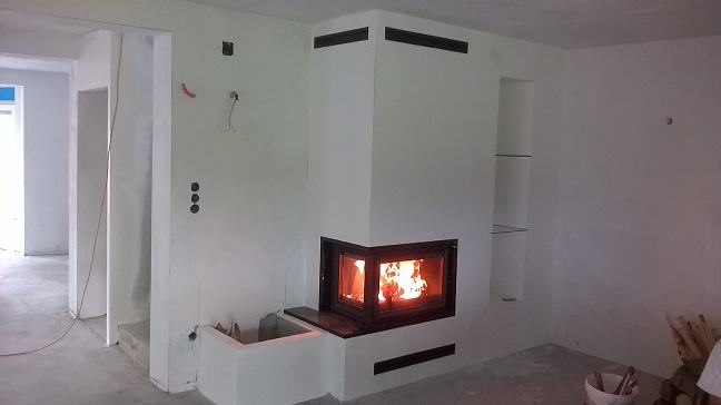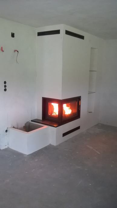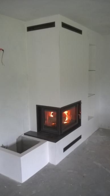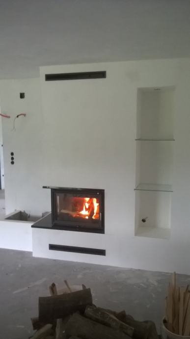 Kamin sa prednjim i lijevim staklom, odvojenim stupićem, jačine od 8 - 25 kw. Što ovisi o odabiru ložišta. Ugrađen je granit Bengal Black.