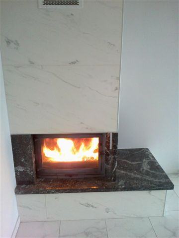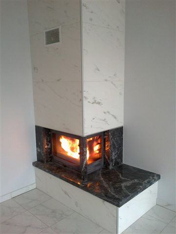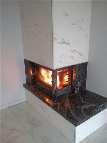 Kamin snage 8 - 24 kw, prednje i bočno staklo. Na policu je ugrađen kamen Paradisso extra. Cijena varira s obzirom na izbor vrste i modela ložišta kao i raznih ugrađenih detalja.