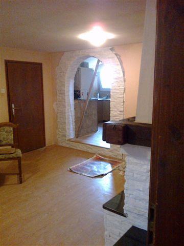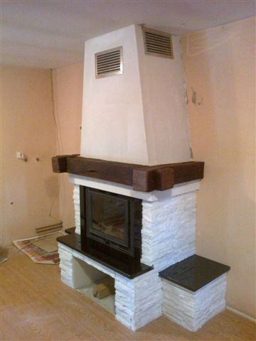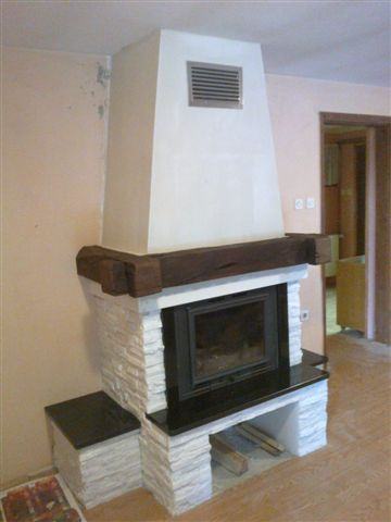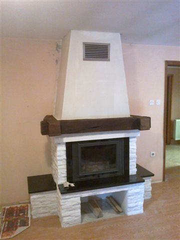 Ugrađeno ložište 14 kw. Kamen na polici ispred ložišta kao i na klupicama je granit Inky black. Kamin je obložen sa bijelom bunjicom - prirodnim kamenom. Za drvenu gredu je upotrijebljena stara hrastova građa.