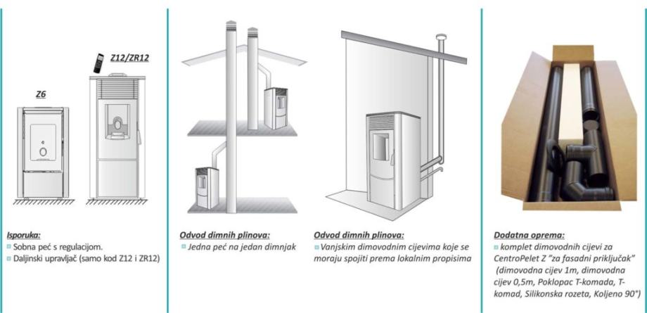 Pelet sobne peći CentroPelet Z6 i A10 su toplozračne peći na drvene pelete namijenjene za grijanje prostorije zrakom uz pomoć ugrađenog ventilatora. Čelične su konstrukcije, modernog dizajna i visoke učinkovitosti. Isporučuju se sa daljinskim upravljačem preko kojeg se može upravljati radom peći te odabirati tjedni program. Velika im je prednost jednostavno korištenje i održavanje te ugradnja.