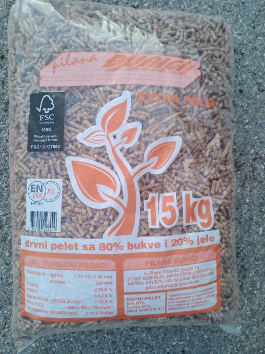 Peleti A1 kvaliteta, 80% bukva, 20% smreka, 1 vreća 6€ , može pojedinačno na vreće. 1 paleta 78 vreća
