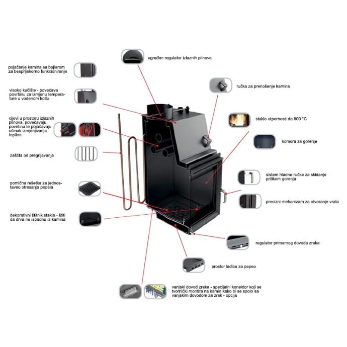Prednji dio kamina, dno i komora za gorenje izrađeni su od kvalitetnog lijevanog željeza tzv. sivog lijeva marke 200 a plašt i bojler izrađeni su od specijalno dizajniranog temperaturno-otpornog čelika debljine 4mm.