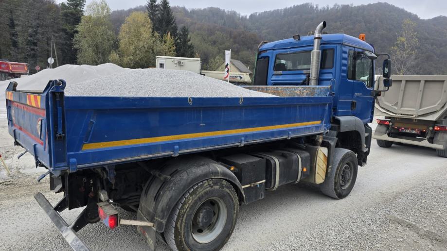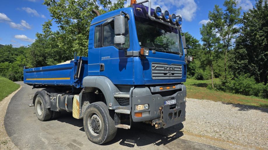MAN TGA 18320 4x4, kiper, sa montaznim brzoskidajucim kranom PALFINGER 10500, 3 hidoizvlacenja, instalacije za zimsku sluzbu, gume 80%