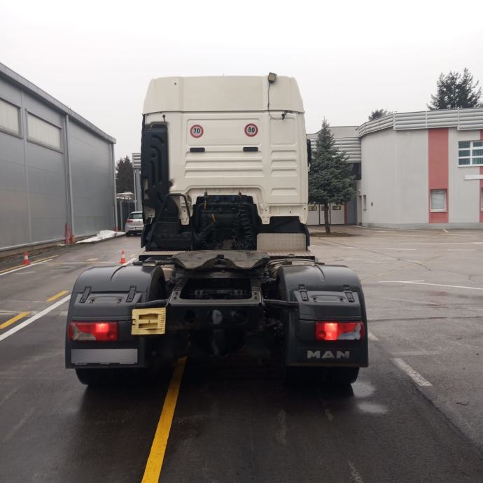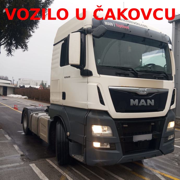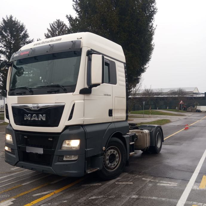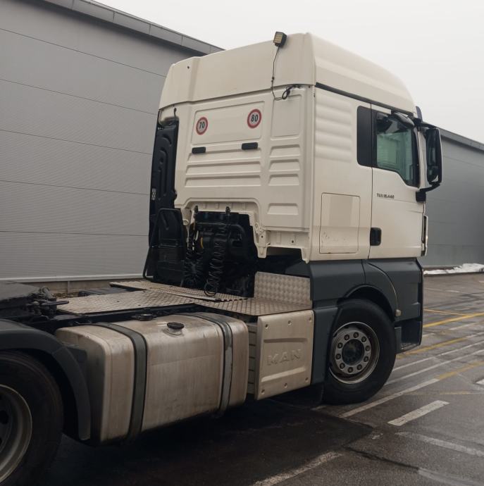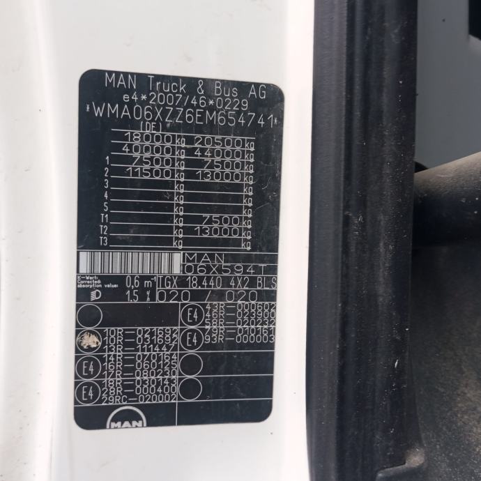 MAN TGX 18.440 BLS, 4x2, u prometu od 07/2014, Euro 6, ABS, EBS, ESP, jastuci straga, retarder, automatik, kiphidraulika, adaptivni tempomat (ACC), klima, webasto, 2 kreveta, radio CD, navigacija, multimedija, NDM 18.000 kg, masa praznog vozila 7.792 kg, nosivost: 10.208 kg, gume 385/65 R22,5 ; 315/70 R22,5. VIN: WMA06XZZ6EM654741