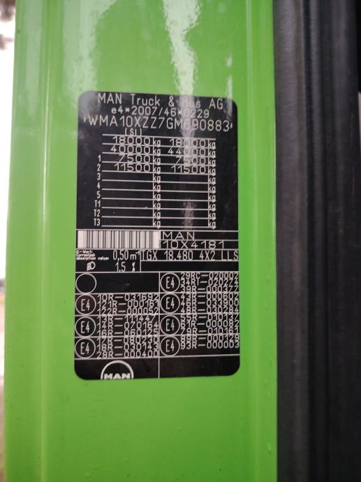 MAN TGX 18.480, 4x2, u prometu od 11/2015, Euro 6, AdBlue, ABS, EBS, ESP, jastuci straga, kiphidraulika, retarder, automatik, klima, tempomat, webasto, 2 kreveta, radio CD, zračne sirene, spojleri, NDM 18.000 kg, masa praznog vozila 7.662 kg, nosivost: 10.338 kg, alu felge, gume 385/55 R22,5 ; 315/70 R22,5. VIN: WMA10XZZ7GM690883