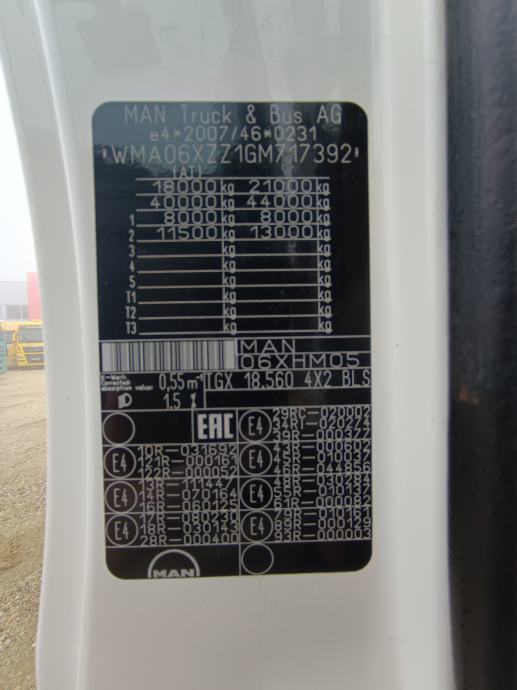 MAN TGX 18.560, 4x2, u prometu od 07/2016, ABS, EBS, ESP, jastuci straga, retarder, automatik, kiphidraulika, tempomat, klima, webasto, standklima, 2 kreveta, frižider, radio CD, NDM 18.000 kg, masa praznog vozila: 8.241 kg, nosivost: 9.759 kg, gume 385/55 R22,5 ; 315/70 R22,5, VIN: WMA06XZZ1GM717392