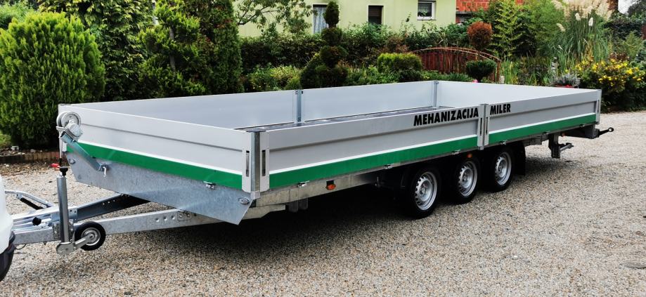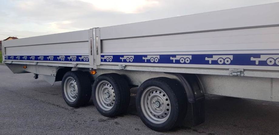U ponudi imamo prikolice od 4,00m dužine do 8,00m i širine do 2,5m s dvije i tri osovine....od 2700 do 3500 kg